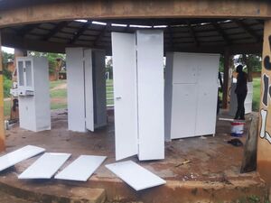 Die durch den Brand verbogenen und verrussten Schränke werden im Sommercamp durch Fachkräfte und unter Mithilfe der Kinder so gut wie möglich wieder hergestellt. Zum Teil können sie im neuen Magazin weiter verwendet werden.